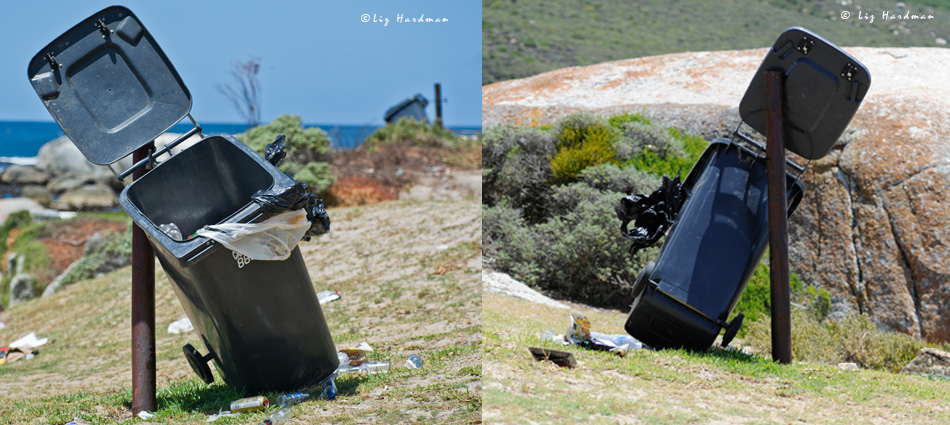 The old blue bins have finally been removed, and the last of the lot has been cast aside and left to rot in the bush.The new 'baboon-proof'' bins at Miller's Point sit on two hooks - the baboons have already learned how to dislodge them. Should the authorities be promoting bin free zones and a take-it-home waste policy?