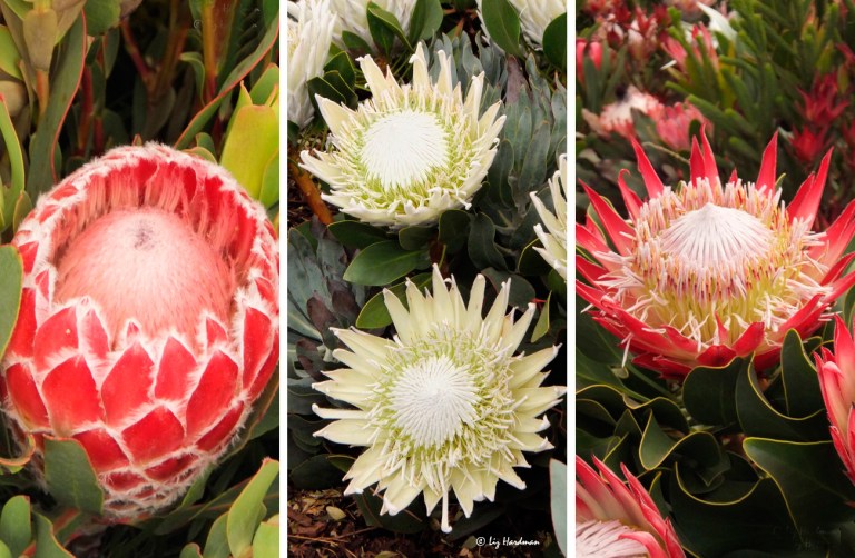 The Cape Floral Kingdom has a fabulous array of plant species (some 8000 and more). Many of the protea family start flowering in autumn, through winter and into spring. Winter is traditionally the rainy season, but it’s also a wonderful time to walk on the mountains. Once the rains have cleared, clear champagne air sweeps in bringing a crisp headiness to being outdoors. Of the 360 species of protea, it is the King Protea (middle and left) which has the most spectacular form.