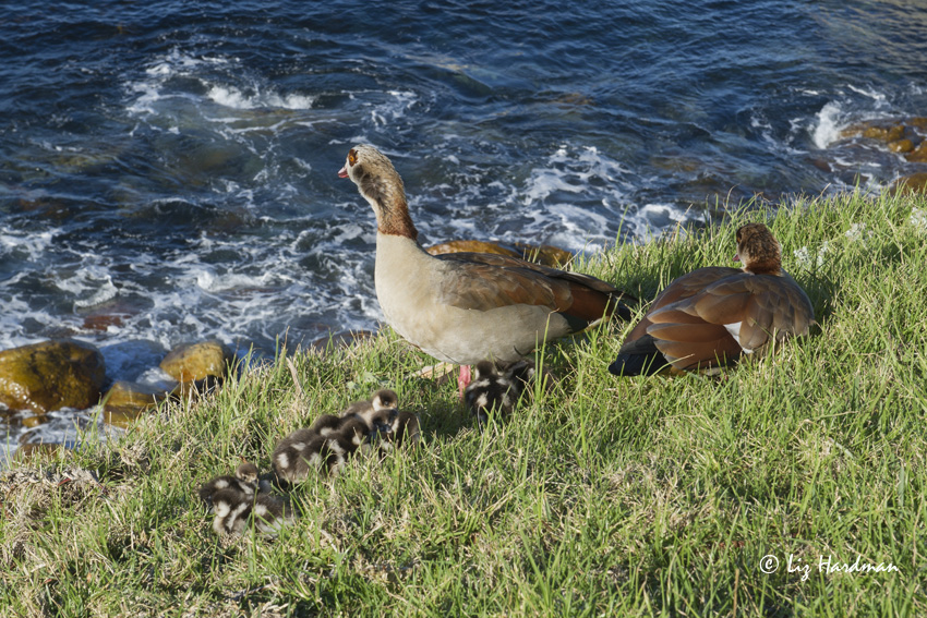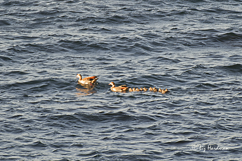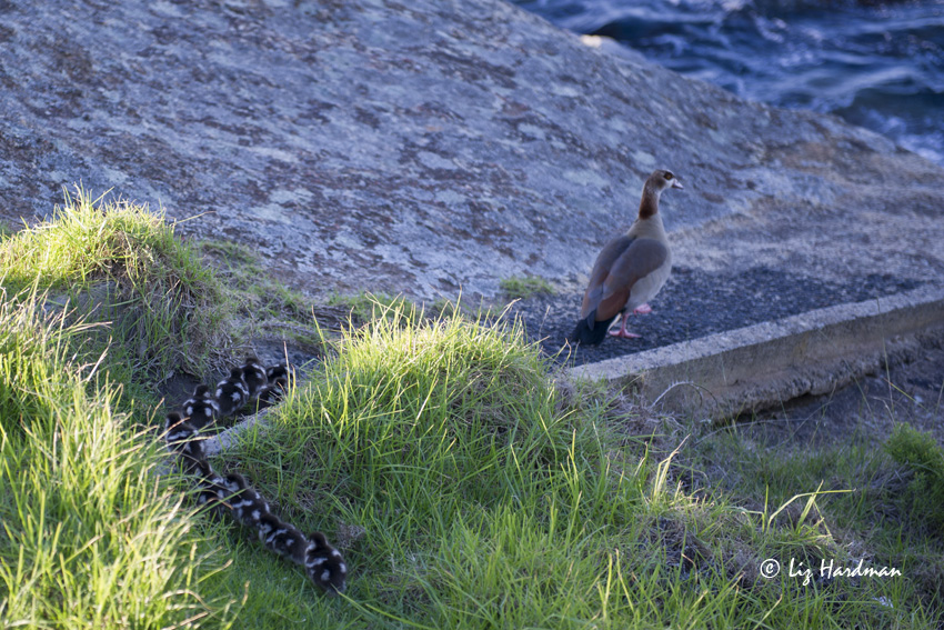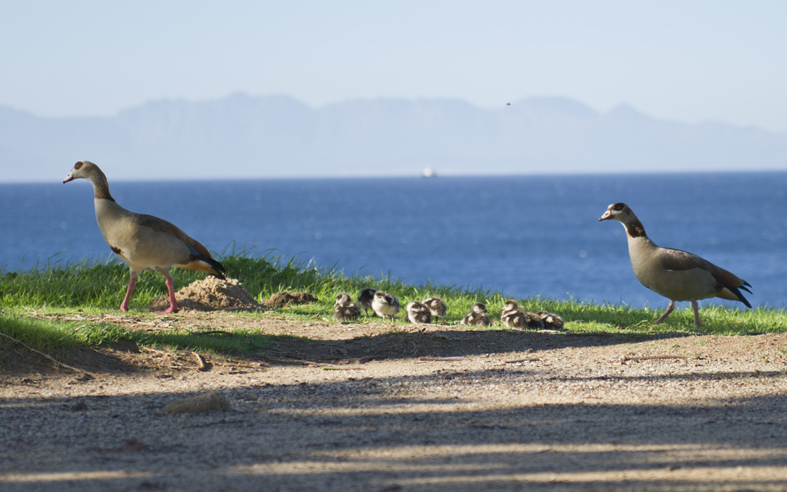 With False Bay stretching ahead, the goslings follow their parents into a stiff headwind, where they must round a headland and paddle towards the next bay. They survive the epic journey, as my neighbour out walking her dog spotted them coming ashore further down the coast. Hopefully I’ll be able to track them down ….