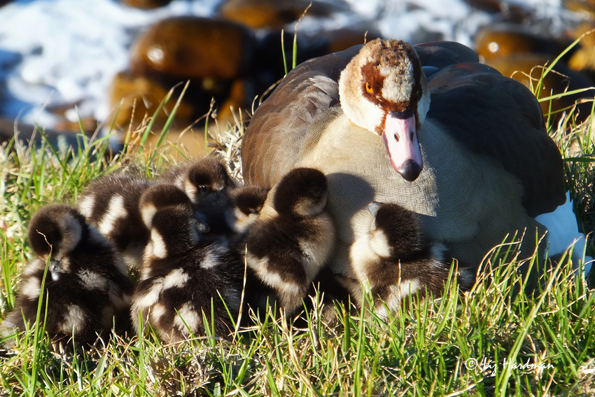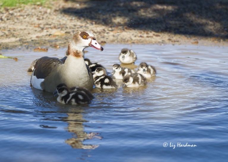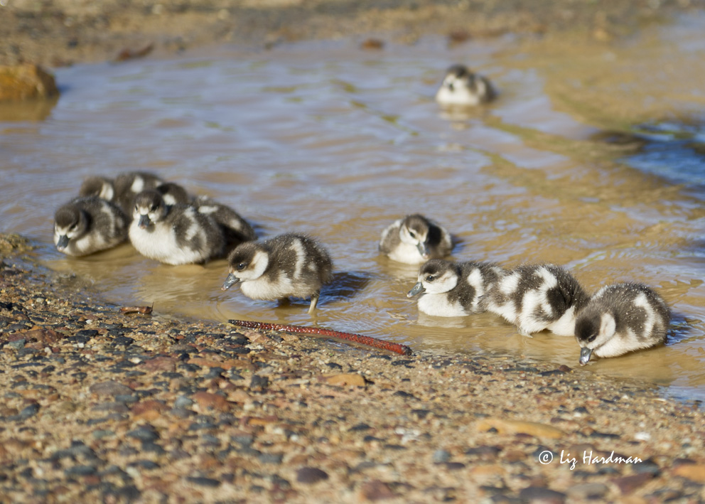 Winter has arrived with a flurry of low pressure weather systems tracking across the peninsula; temperatures have dropped and the rain squalls have been frequent these past weeks. Yet a pair of Egyptian geese have already had their first hatch of chicks, getting in well before the spring rush. For whatever reason the parents evacuated their nesting area to relocate…. and with much raucous squawking Pa Gander marched his family (10 chicks) on a long journey.