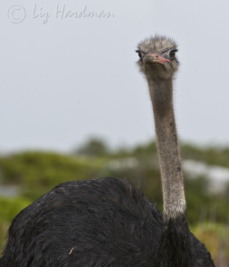 It had been raining heavily and you’ll notice that the black feathers appear tightly coiffed, while the white tail feathers look quite bedraggled.  Interestingly the feathers are not oiled and hence they absorb water when it rains.    The feet have only two toes, the larger with a long nail.  Their powerful legs aid in defense by delivery of a lethal kick, or impressive running speeds help in escape.  The courtship ritual involves a mesmerising dance sequence, with wonderful tail feather choreography.   I’m hoping for a ringside seat for that show….   actually one needs to keep well away, ostriches are known to be volatile in the mating season.