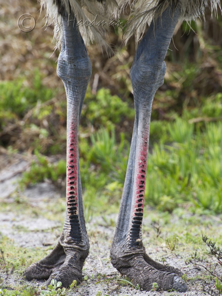 Don’t you just admire the way male birds go about attracting mates?  For most of the year they’re in nondescript plumage, but come breeding time and they sure do strut their stuff.   Last week when visiting a friend on the other side of the peninsula, who has a bird feeder in her garden, we were entranced by the showy Red Bishop in his crimson hood and the Pin-tailed Whydah sporting ostentaciously long ribbon tail feathers.  Very impressive accoutrements.  Today at my end of the peninsula,  I was happy to discover our largest bird is sporting another cue: sexy legs.