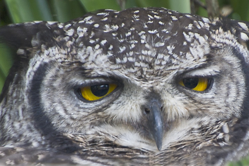 Kirstenbosch, Cape Town’s botanical garden, is a lively place, well patronized by locals as well as visitors. It’s really busy in spring when the flowers put on a spectacular show. There’s a host of activities during this season, not least that of the feathered variety. The sunbirds and sugarbirds dart among the protea pincushions, sipping sweet nectar; thrush, Cape robins, prinia flit in the lower branches catching insects on the wing. Right in the heart of the garden at a busy intersection of pathways sits a Bubo africanus – a Spotted Eagle owl on her nest. In the branches above the male bird casts his beady eye.