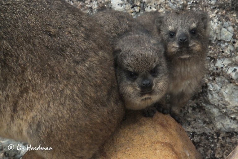 The news is out! My neighbour confirmed today that our nearby colony of dassies (Rock Hyrax) have produced the first of the summer litters. Late this afternoon I went to investigate and sure enough found among the rocks evidence of the furry, bouncing bundles. A week ago, I suspected the happy event must be imminent after spotting “Fat Mama”, the charismatic alpha female munching my flowering arctotis daisies. She’d waddled slowly across the patio, telltale petals protruding from her mouth looking heavily pregnant. Between one to six young are born after a seven and half months gestation period, and this year “Fat Mama” has four. Some of the other females have also produced and so far there are eleven in all. Their numbers during the year decreased through predation by lynx; let’s hope it’s a good batch to make up for that loss.
