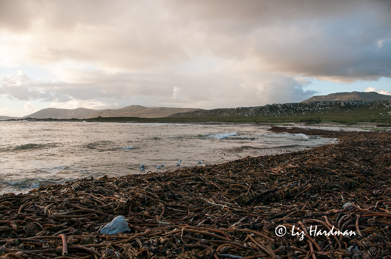 The kelp-line is tossed up the beach.