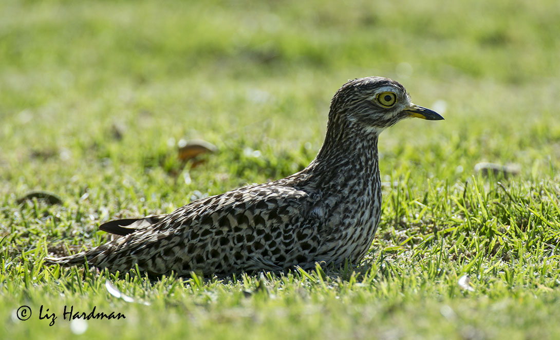 Generally these mottled birds like to blend in and settle for well camouflaged nesting areas, but here in broad-day light is a highly visible pair nesting smack in the middle of an open grassy patch bordering two houses. They have nested in the area before, but closer to the shelter of the scrubby vegetation, or just beyond the high-tide mark in a stony area on the beach.  The incubation period is about twenty-four days and it will be interesting to see if they are successful in raising any chicks.  Usually they lay up during the day and tend to be active at dusk and into the evening when their mournful song adds a haunting note to the background sounds of the night.