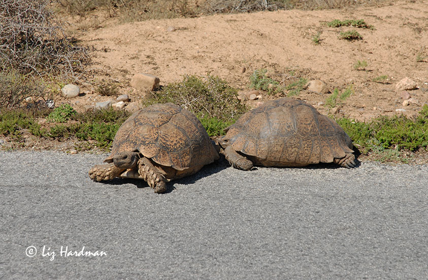 One of the popular bushtales from the Addo Elephant Park is that of a legendary mountain tortoise of enormous strength, dubbed “Domkrag” (carjack). He endorsed his reputation of Herculean strength by trying to flip stationary cars defending territorial rights on his stretch of the road. He was of a ripe old age, but apparently met an ignominious death by falling down an aardvark’s burrow.