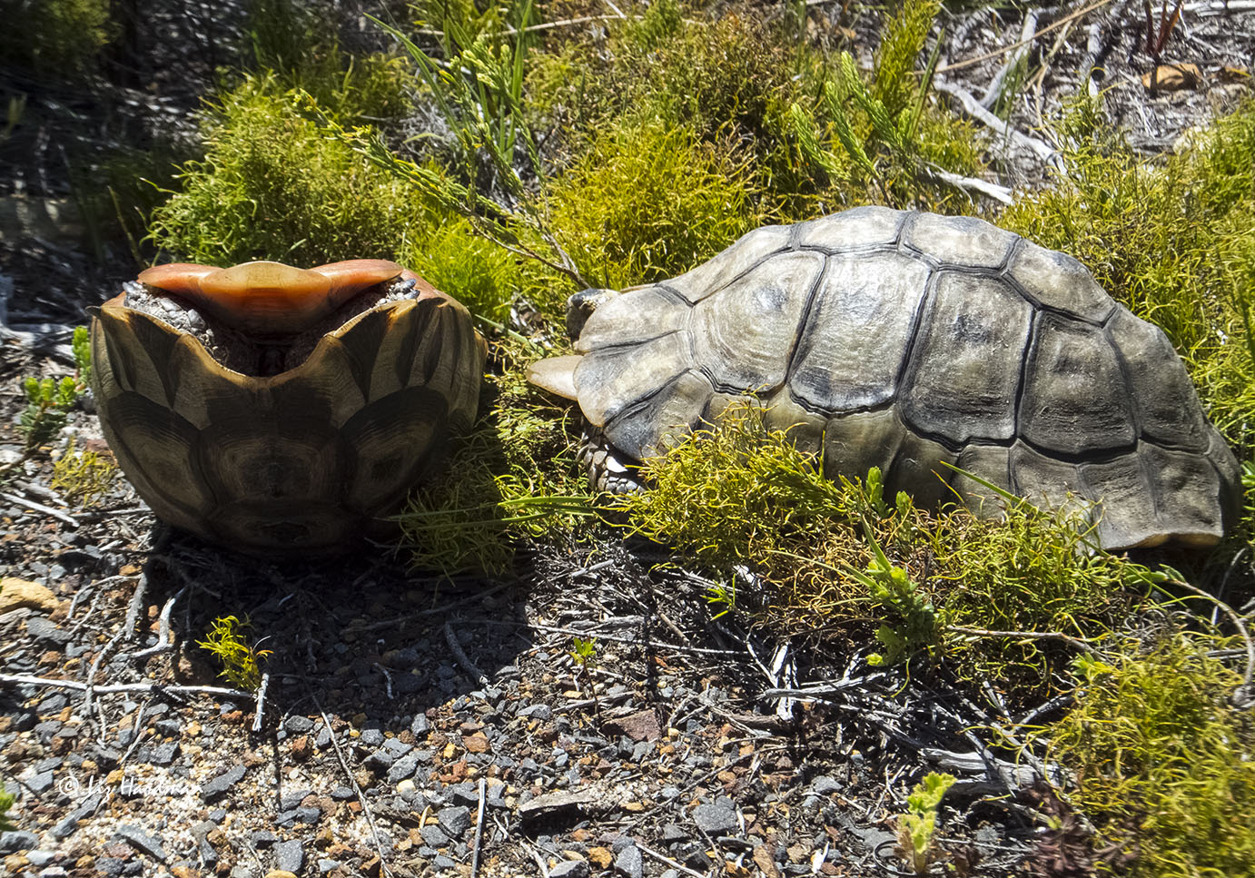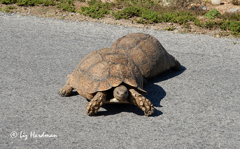 Some weeks a species will be more visible than usual and activity is trending in the reptile sector: tortoise jousting! We are fortunate to have eight out of the thirteen tortoise species endemic to South Africa, in the Western Cape. The coastal variety, the angulate (Chersina angulata) is the most active, and the males have the dubious reputation for being the most truculent. They engage in lengthy bouts of combat and use the enlarged shields beneath their necks to flip their opponents onto their backs. Meanwhile the wiley females lurk as spectators in close distance to claim he who triumphs. The confrontations can be quite brutal, rather like a game of dodgem cars, a fierce clashing of carapace, bashing and flipping motions.