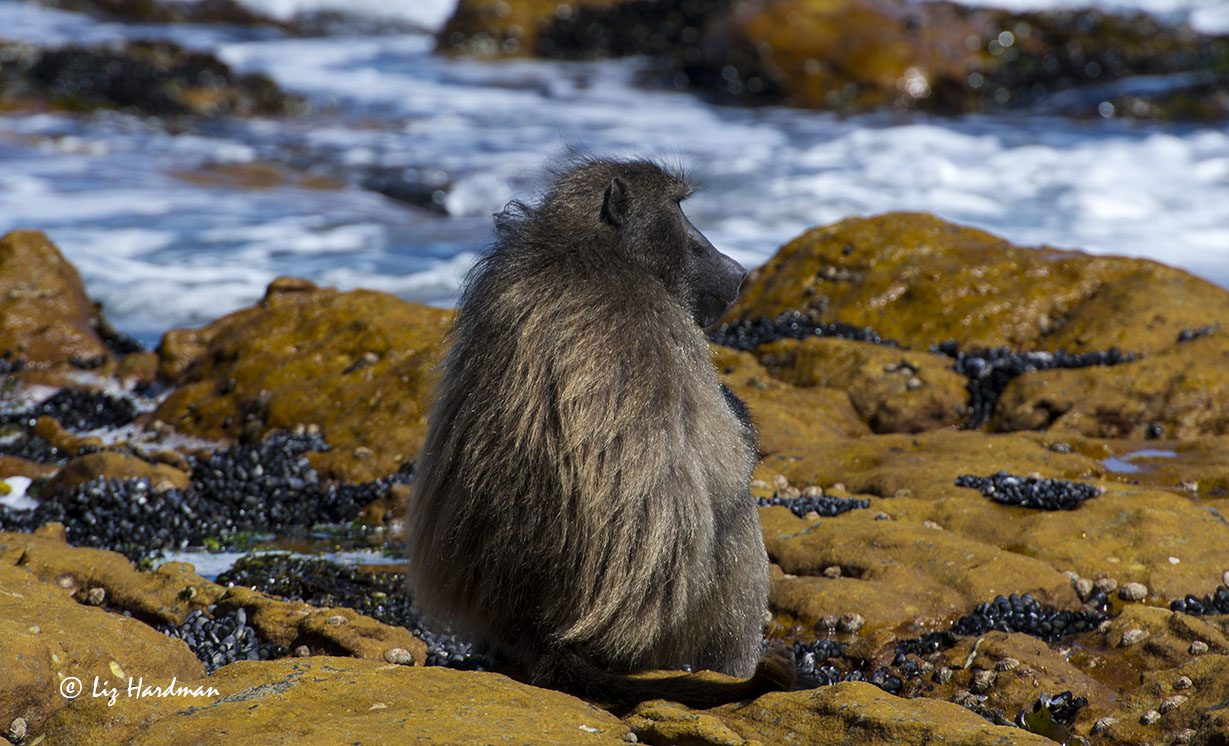 It’s always a thrill to come across baboons foraging along the shoreline and in the rock pools and such was our luck today at Cape Point, Platboom beach.  Generally their preferred diet is plant based, but several troops have adapted to eating mussels, limpets and crustaceans such as crab.  It provides valuable omega oils and proteins to their diet.  There were about twenty or so baboons in this troop and I couldn’t help admiring the statuesque alpha-male with his thick ‘cape’.  The inland troops tend to be much darker in colour, while the coastal troops have much lighter fur – sun bleached highlights, with a bit of a ‘beach-bum’ attitude.