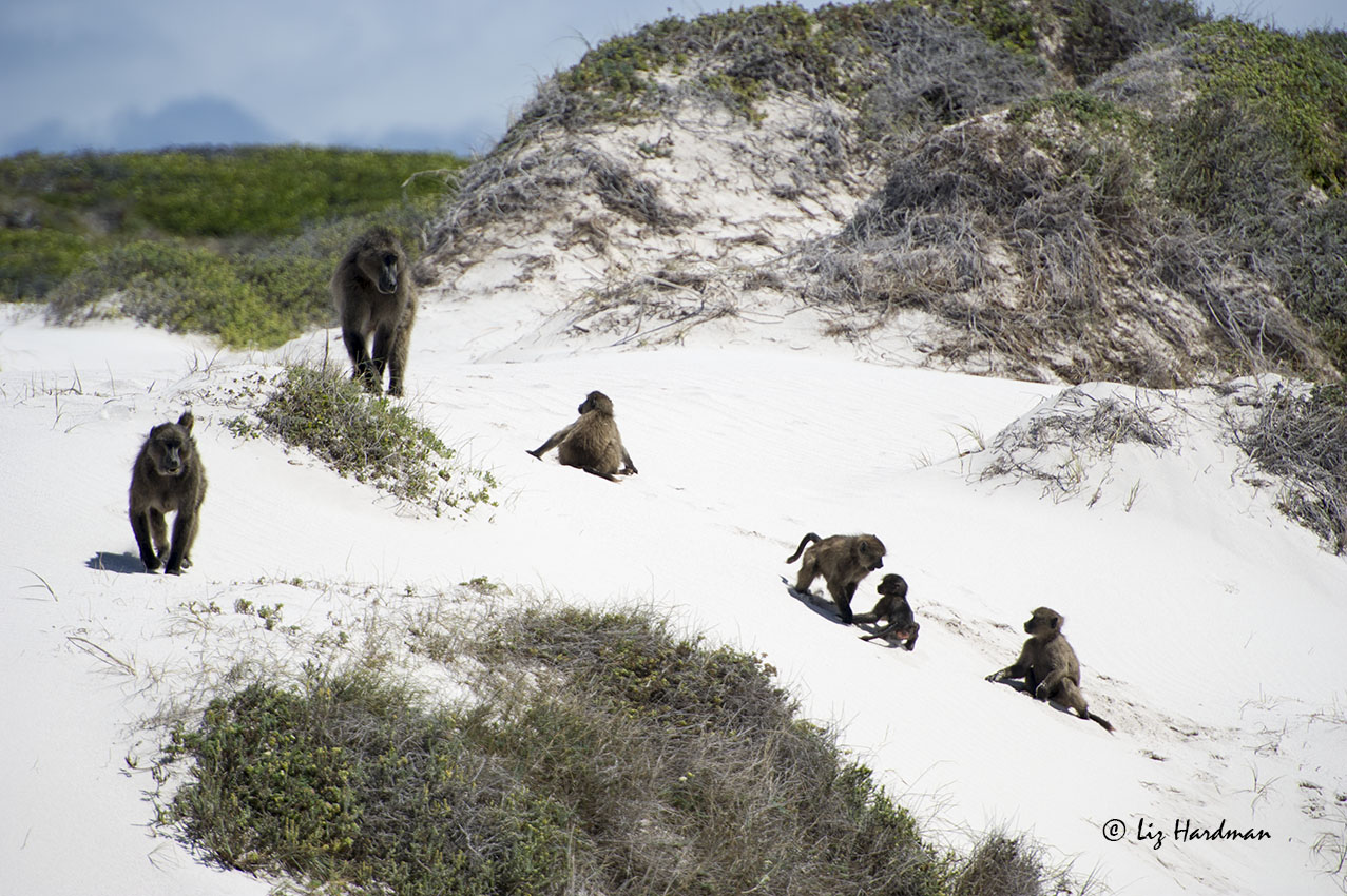 The swallows are forgotten as the antics of the baboons catch my attention.  The three juveniles and baby can’t resist sliping and sliding down the dune and in their indulgence of the rough and tumble of everyday play :