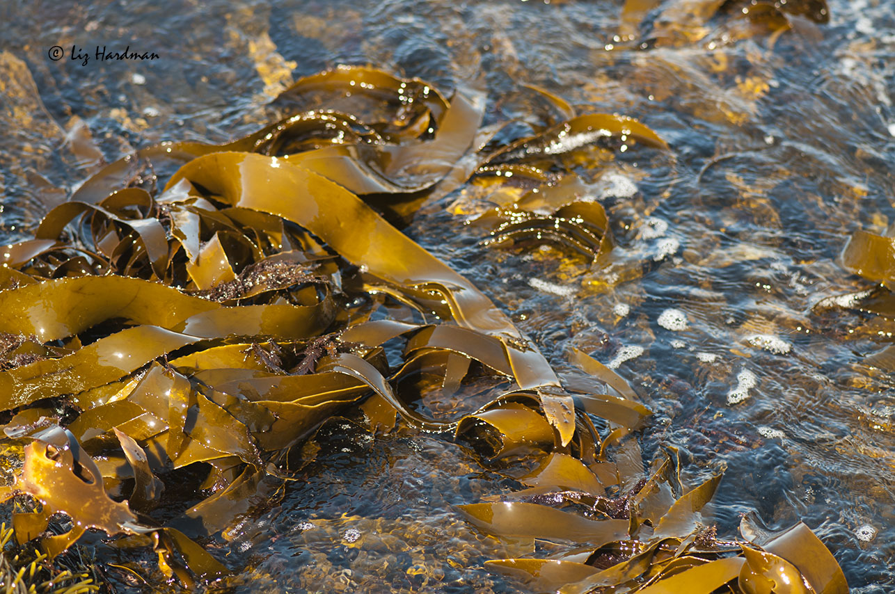 Here along the coastal edge of the Cape peninsula, kelp forests create unique ecosystem and provide a sheltered habitat for smaller creatures from the force of breaking waves.   The photo shows the top fronds of the canopy afloat on the surface of the sea at low tide.   It has a neat construction where hollow gas-filled stalks expand into  bulbs at the top which then act as floats for the strap-shaped fronds.  Creatures such as rock lobsters and sea urchins, mussels and sea cucumbers are typically associated with sea bamboo.