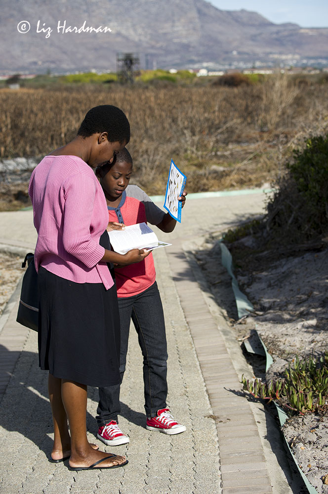Checking out bird charts and plant lists