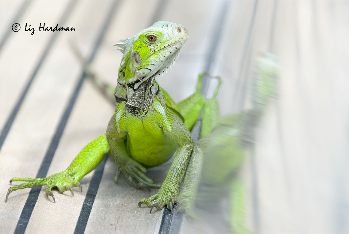 Aren’t they rather ‘eye-catching’! There’re the tropical variety of iguana, so far more vivid in their coloration than those in the temperate zones. The fellow with the big eyes and toothy grin I found in my bougainvillea – a locust with a voracious appetite 🙂