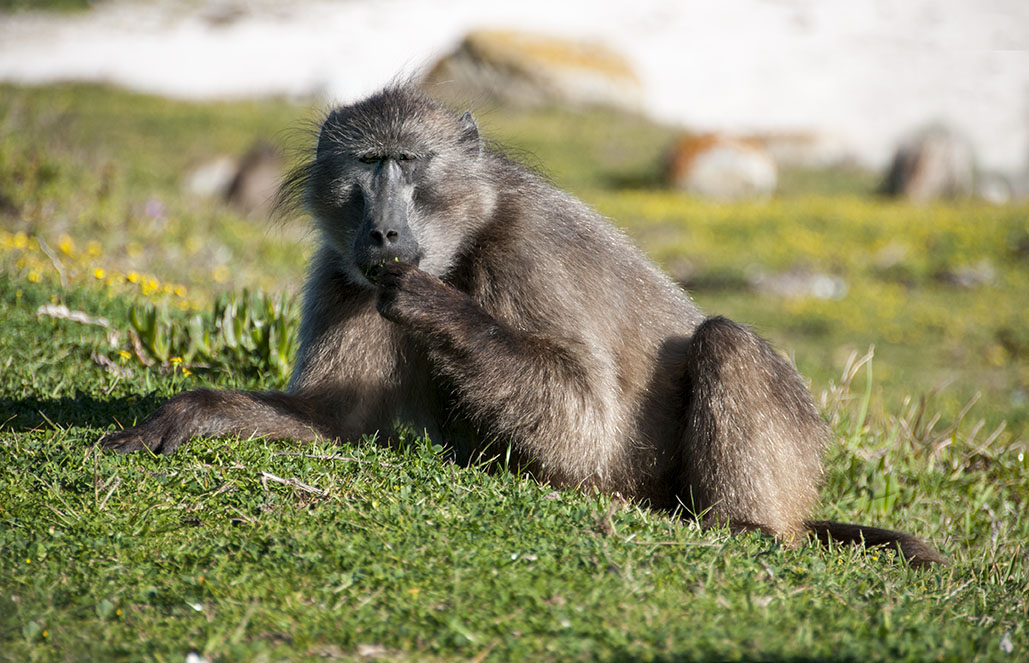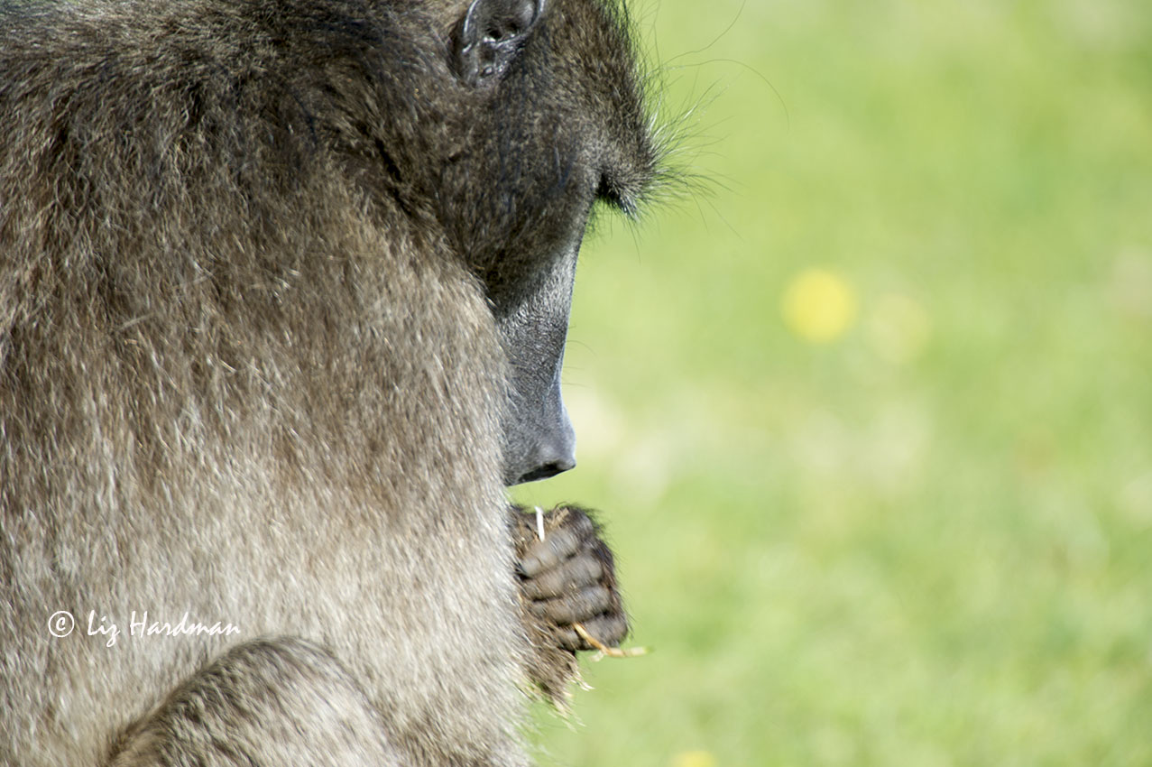 Gathering a morning snack and getting to the succulent part of grass roots requires a bit of dexterity.  Baboons have opposable thumbs and strength in their fingers.  A good bit of digging and fine pruning does the trick.