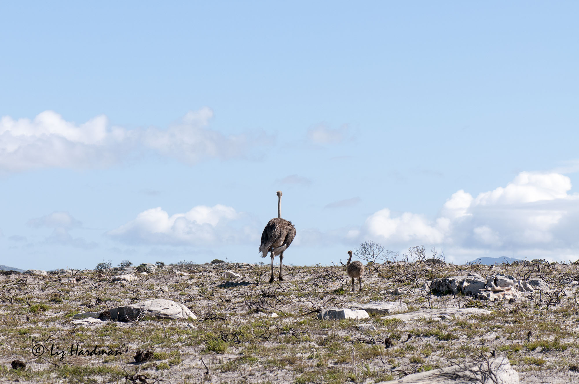 My early morning cycle ride in the Cape Point reserve came to a halt as I came across a large family of ostriches. Pa flapped his wings at me so I backed off to watch at a distance. The adults are protective of their young and there were at least 12 chicks.