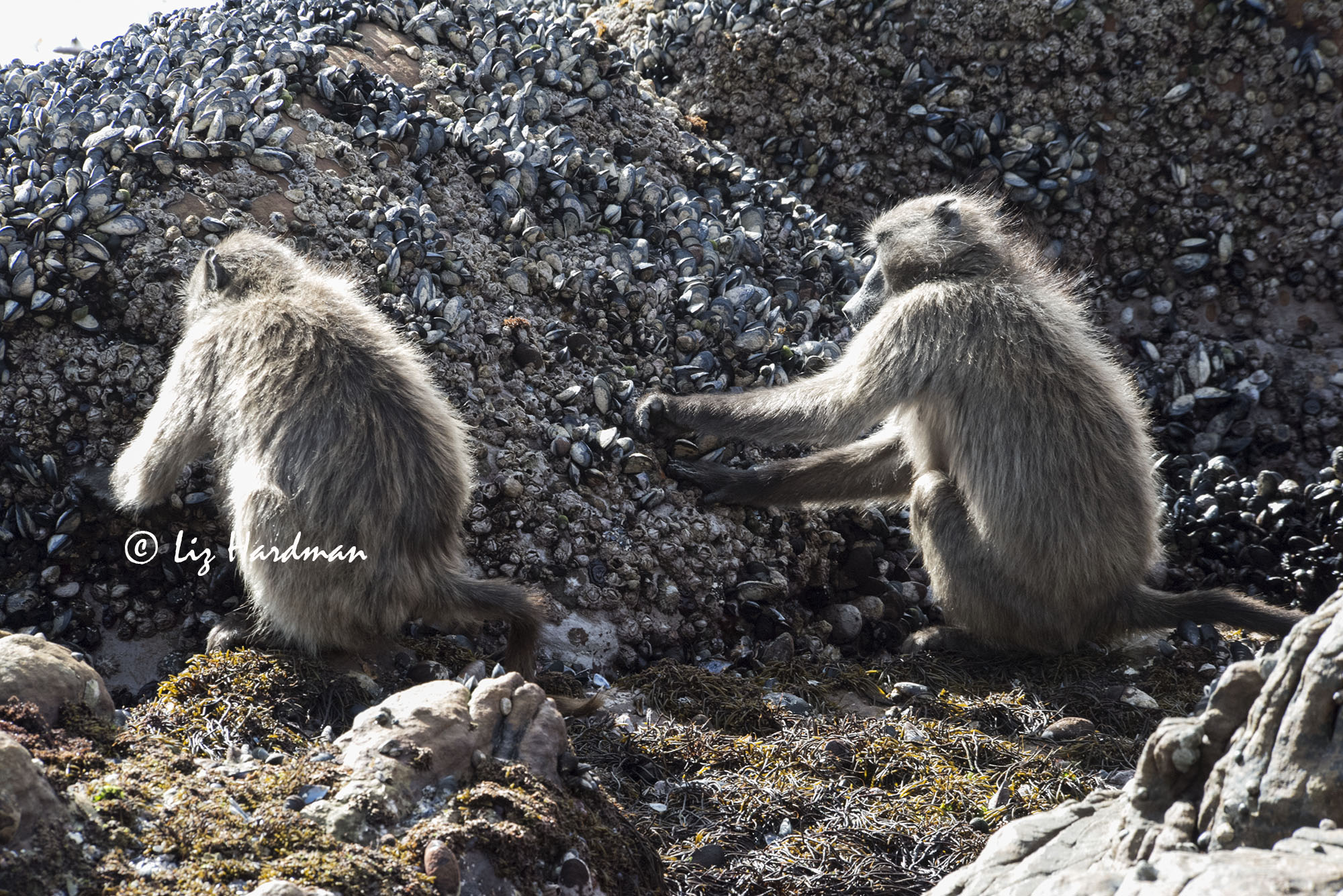 Baboons forage at low tide while Caracal lurks nearby