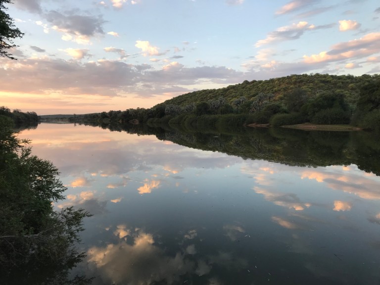 Twilight in Southern Africa is a short affair – 45 minutes after sunset and evening rustles in. As birds and animals come in to roost there’s a gradual lessening of ‘chirp’. Here at the Kunene River Lodge the wind subsides and the water takes on a heavenly appearance to perfectly reflect the sky and clouds. It is remarkably serene – for about 15 minutes before the night chorus cranks up. Cicadas, crickets, frogs, night jars all tune up and deafen the night in syncopated symphony.
