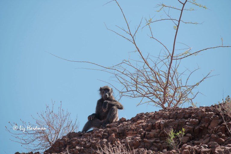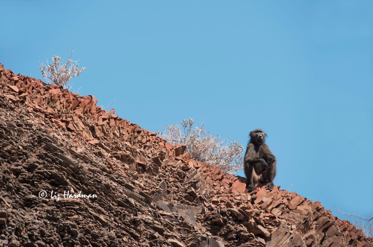 I’m fascinated by these desert baboons – they looked to me to be conserving energy – and I loved their postures too – so relaxed – legs splayed, arms open, hands and palms open to catch any breeze. Looked so like ‘Mr Harry Casual’. My first reaction when they came into view was whether they had ulterior motive! But unlike their Cape Peninsula cousins, they have not been exposed to ‘easy food’ pickings. So we passed peacefully. Oh how I would love to be able to mind read baboons! Perhaps they have the better measure of us humans!