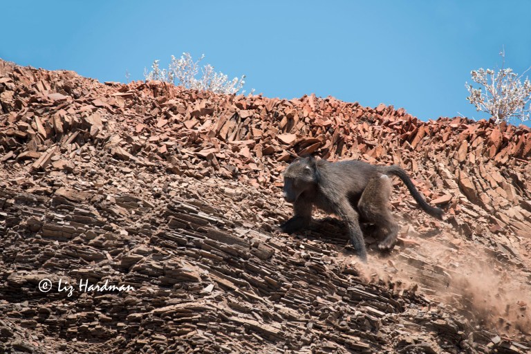 We spot baboons nine separate occasions through the trip, but they immediately clear out, vanishing from view. Not this time – they take up seats in the pews above and we’re being scrutinised. We, the interlopers to this geological attraction take care not to be too intrusive, guessing that they want to descend to find water in the damp sand. It’s hot, searingly hot and i notice that their fur is fine and sparse and that males don’t have the magnificent ‘manes’ that the coastal species have.