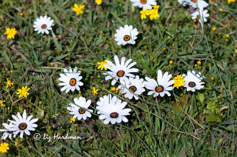 The osteospermums were the first to make an appearance with the felicias and senecias opening close behind and now the vibrant vygies are splashing out in a voluptuous spread.