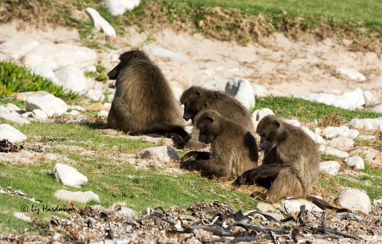This Chacma baboon troop is one of the wild troops living within the park. There are only two troops which aren’t habituated to raiding anthropogenic food sources and forage only in natural fynbos and the rock pools for shellfish.  The rest of the troops are under threat one way or another, either through being attracted into residential areas or through poor conservation practice.  Generally there is an overlap into their home range where human recreational facilities feature vineyards, restaurants, picnic and campsites.  If baboons know they are going to get easy rewards and when residents and property owners do not secure garbage bins or adequately baboon-proof their properties / homes, baboon raiding patterns become entrenched as they will return over and over.  If they learn to rely on human food it voids their inherent role in the ecosystem and disrupts their social relationships.  They can become aggressive and when they have to be euthanised there is much outrage often from the humans who are the cause of the entrenched raiding patterns in the first place.  While SANParks recognise the ‘res nullius’ free roaming status of baboons, there is a lack of law enforcement for fining people who feed the animals nor are there enforceable by-laws for securing garbage so ultimately it’s the baboons which suffer the consequences.