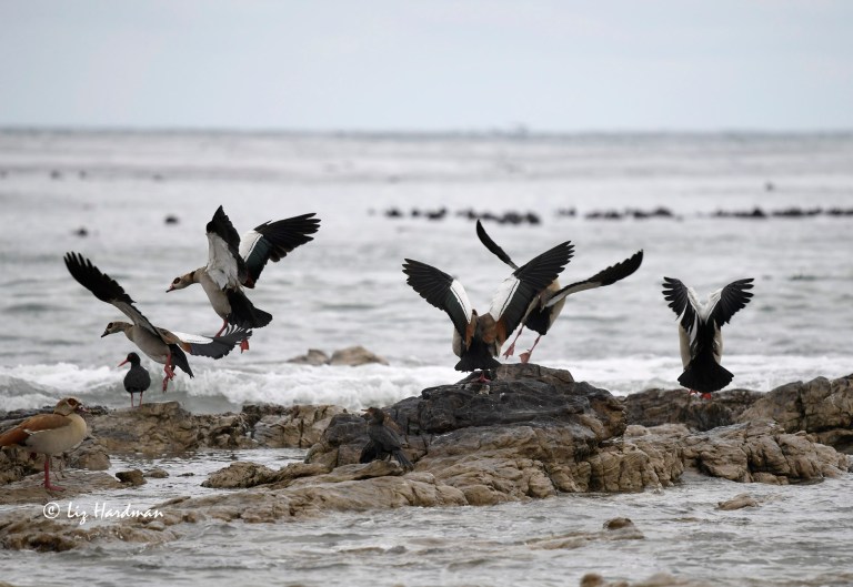 Matching the colours of the kelp, Egyptian Geese gather into a gaggle.