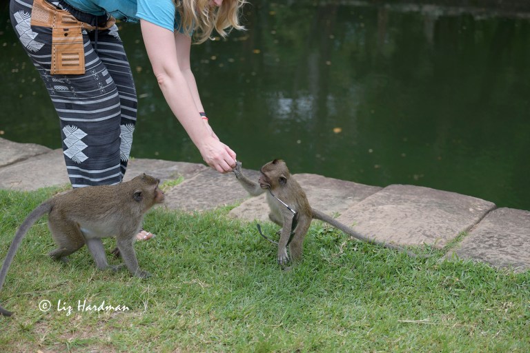 Well blow me down!  Half a world away from the wiley baboons of the Cape Peninsula, (South Africa) here in South East Asia,  Cambodia – the Angkor Wat troop of long-tailed macaques (Macaca fascicularis) have similar tactics, grabbing an item and waiting for the gullible human to offer decoy food in exchange.