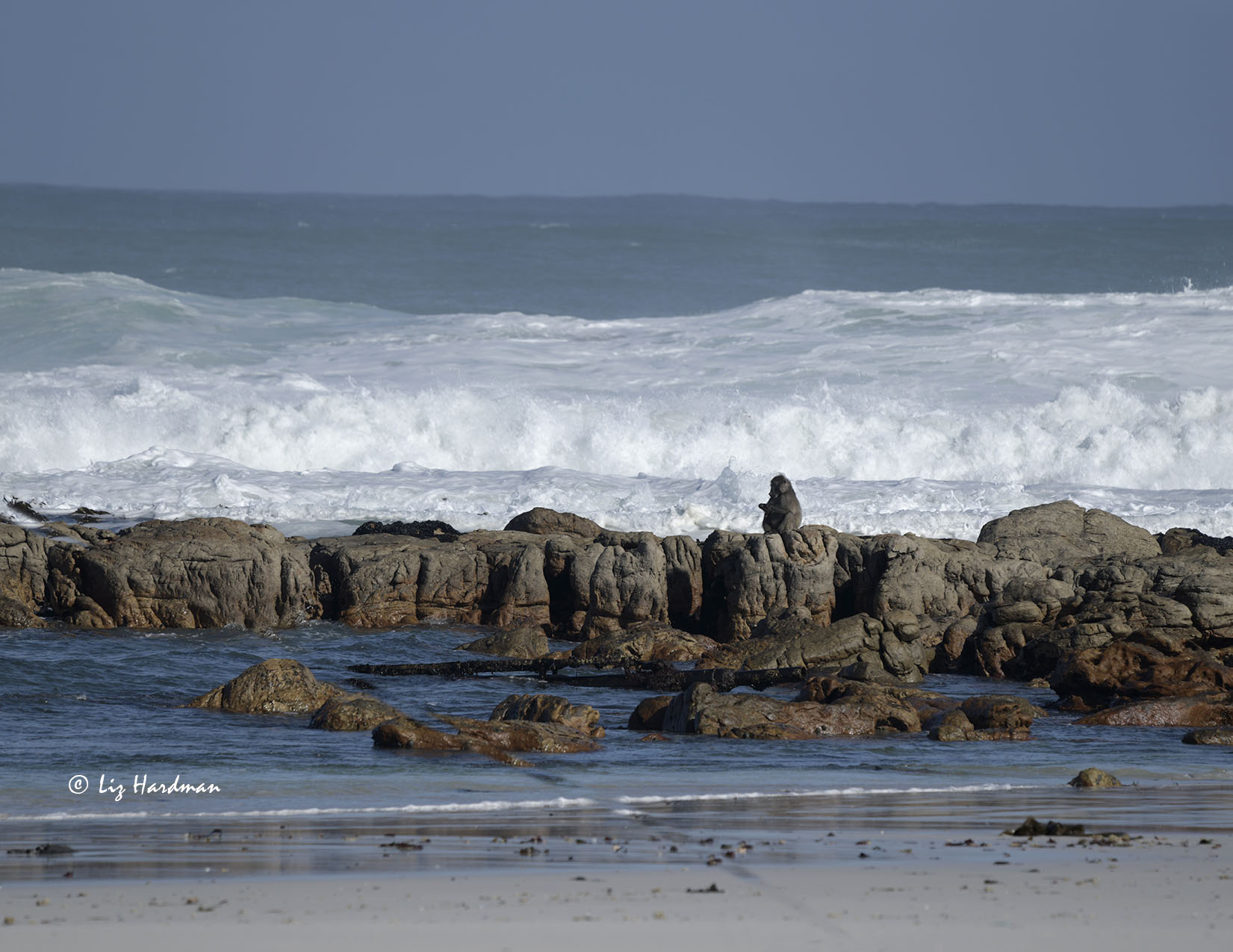 Yes 🙂 and ‘wild’ it was! After days of stormy weather, the sea conditions were high; the beach had been rearranged by high tides and rain run off and the baboons looked to be relishing their foraging opportunities. Sea wrack and kelp had washed up and their were feasting on the mussels and shark’s purses tangled in the kelp. Having a high time of it.