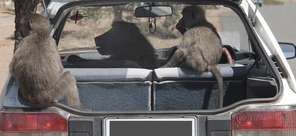 It all began with the picture below and the subject of human / wildlife conflict, back in March 2009. The image was submitted to a local newspaper to raise awareness on the spate of incidents involving baboons raiding cars along the scenic road to Cape Point. An anthropomorphic interpretation brought many off beat responses including the newspaper’s daily cartoonist weighing in on the subject – a portrayal of the shoe being on the other foot, so to speak….